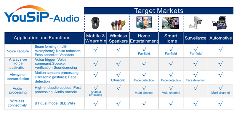 Strong functions as voice capture, always-on voice activation, always-on sensor-fusion, audio processing and wireless connectivity can be supported by YouSiP-Audio.