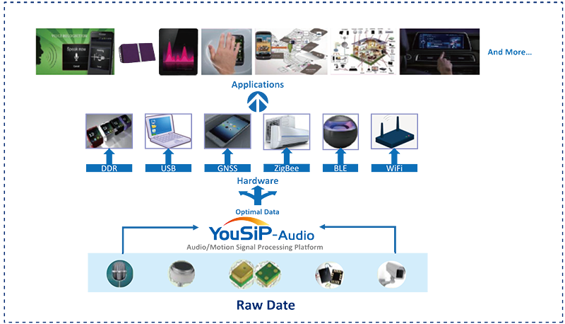 YouSiP-Audio develops a total hardware solution to collect the raw audio, voice, motion, ultrasonic, and image signal data, and then passes them to the host equipment.
