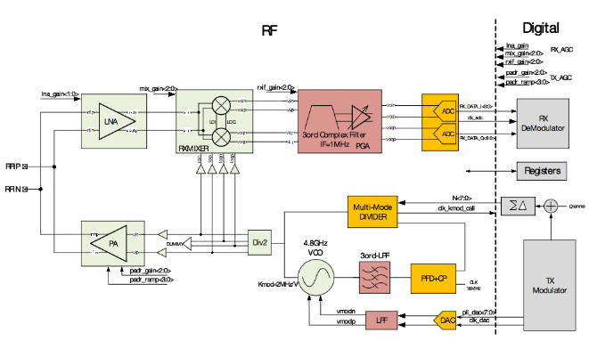 射頻信號從天線接收后,經(jīng)過低噪聲放大器(LNA)放大,再送到RXMIXER。然后,RXMIXER的同相和正交相位兩路輸出被傳遞到復(fù)數(shù)帶通濾波器,用于通道選擇。濾波器的輸出被基帶PGA放大后,然后被送到9比特ADC量化。信號降頻到基帶和鏡像信號的加強抑制是在數(shù)字域進(jìn)行的。